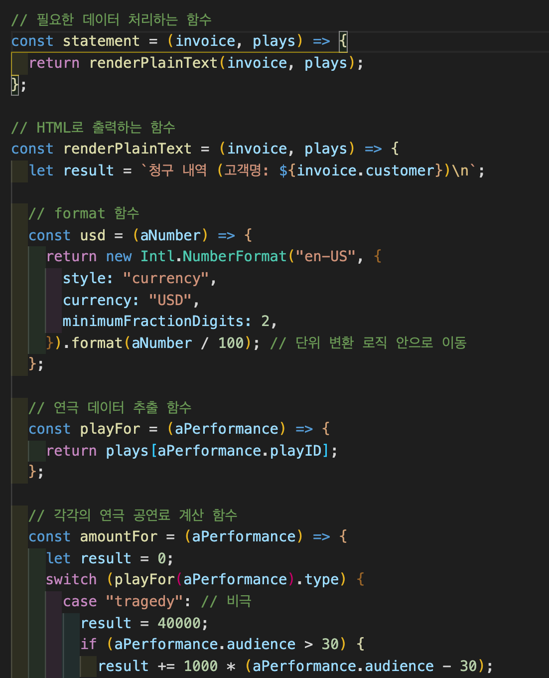 Refactoring(3)에서는 계산 단계와 포맷팅(html로 표현)분리하기 부분을 다루도록 하겠습니다.