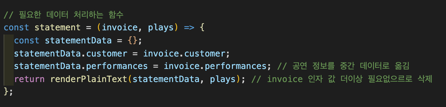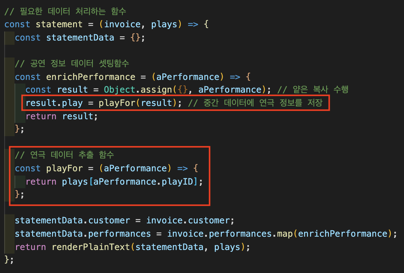 얕은 복사를 수행하여 연극 정보를 담을 객체를 만들었으니, 연극 정보에 대한 데이터를 담아야합니다. 먼저 연극 제목을 담겠습니다. 이를 위해 "함수 옮기기"를 적용하여 playFor() 함수를 statement()로 옮깁니다.