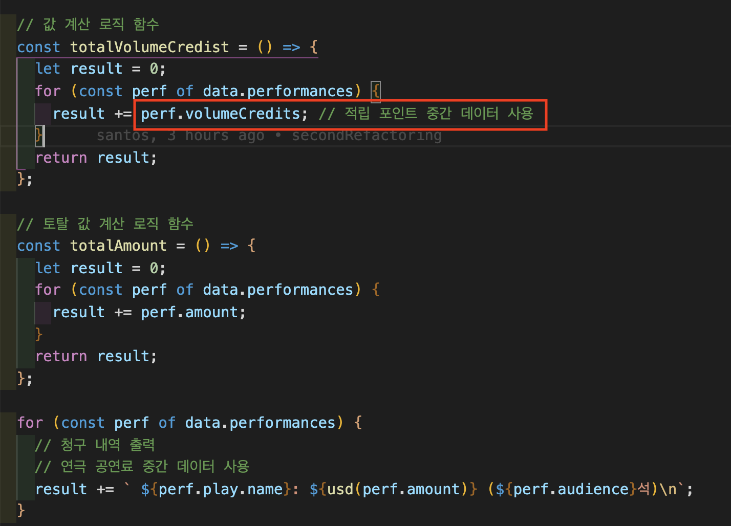 result.volumeCredits = volumeCreditsFor(result); // 적립 포인트 계산 함수 추가