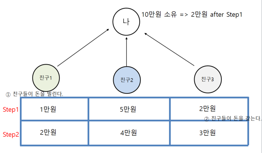 3) Step 1에서 친구들에게 돈을 빌려주면 Step2가 시작되기 전 각 친구들은 빌려준 순서대로 돈을 갚는다.