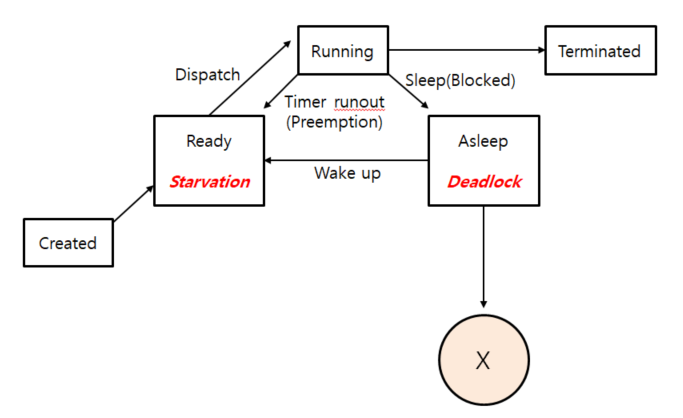 * Starvation: Process가 자원을 얻을 수 있는 즉, 발생할 수 있는 가능성이 존재