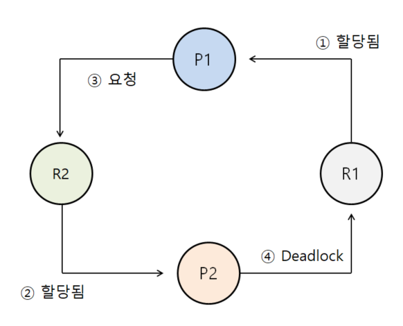 * 점유대기: 최소한 하나의 자원을 점유하고 있으면서, 다른 프로세스에 할당되어 사용되고 있는 자원을 추가로 점유하기 위해 대기하는 프로세스