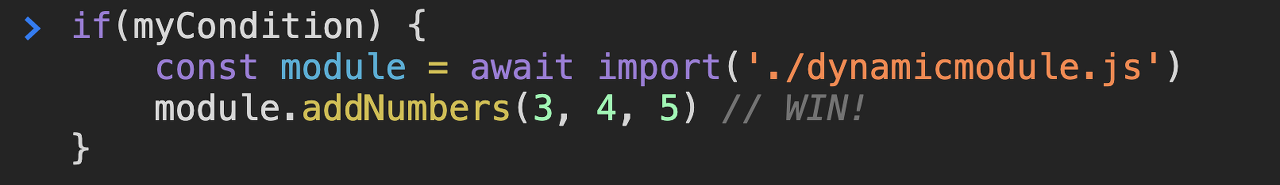 이 기능은 on-demand-request code 에 놓을 수 있고, 모듈 번들러나 Webpack의 오버헤드 없이 코드 스플리팅 할때도 효율적입니다. 또한 if-else block 내에 조건에 따라서 모듈을 import를 할 수도 있습니다.