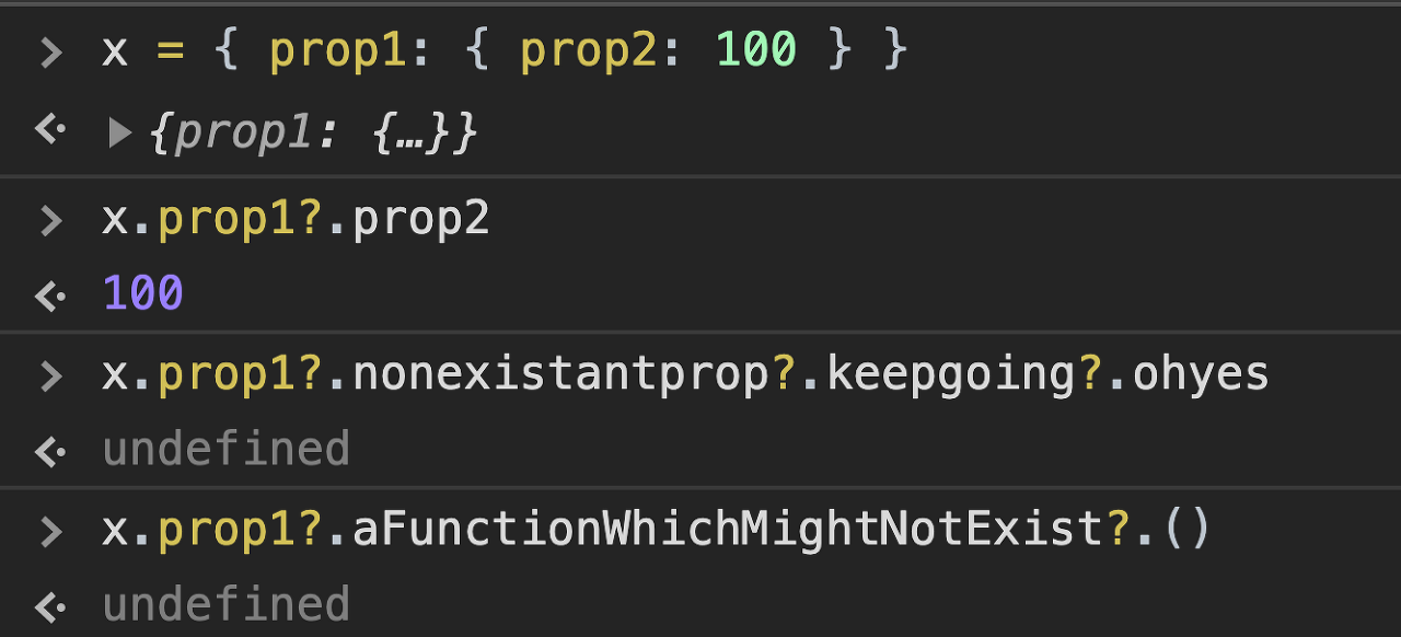 Optional chaining 문법은 객체 내의 프로퍼티 존재 유무에 상관없이 nested된 객체 프로퍼트를 접근할 수 있도록 도와줍니다. 존재하면 값을, 존재하지 않으면 undefined를 리턴합니다.