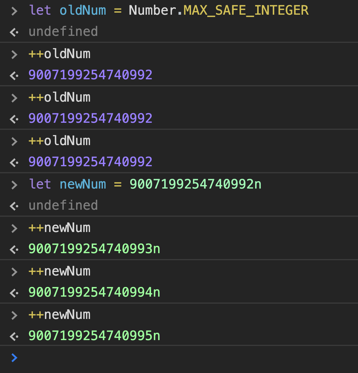 한가지 유의할 부분은 BigInt를 실행하기 위해서는 정수의 가장 끝부분에 n을 포함시켜줘야합니다. javaScript 엔진(v8 또는 다른 엔진들)에 따라 다르게 처리되기 때문에 여기서 n은 BigInt를 대표합니다.