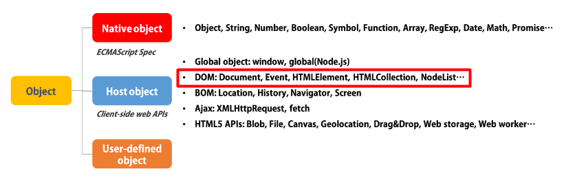 클라이언트사이드 JavaScript 언어를 통해 DOM을 조작할 수 있는 이유는 document 객체는 프로퍼티(properties)와 메소드(methods)를 가진 빌트인 오브젝트(built-in object) 이기 때문이다.