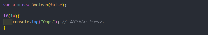 false를 래퍼 객체로 감쌌지만 문제는 a가 객체이기 때문에, 예상과는 달리 안에 들어있는 false 값과는 반대의 결과가 나온다.