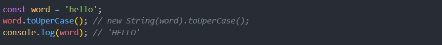 코드 첫번째 줄을 보면 word 라는 변수에 'hello' 라는 값을 할당하고, 두 번째 줄에서 문자열 'hello'의 속성(프로퍼티)를 참조하려고 하는 순간, 이 때가 가장 중요하다. 이 순간 JavaScript는 new String(word)를 호출한 것처럼 원시 타입인 String 자료형을 이용한 Wrapper Object(래퍼 객체)를 만들고 프로퍼티에 접근 한다. 중요한 것은 이 과정에서 원본에는 아무런 영향을 미치지 않는다는 것이다.
