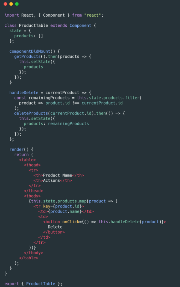 ProductList와 ProductTable은 prop으로써 상품의 데이터를 가지고 오는 함수 Component로 만들어 테이블의 row로 rendering 시킬 수 있습니다.