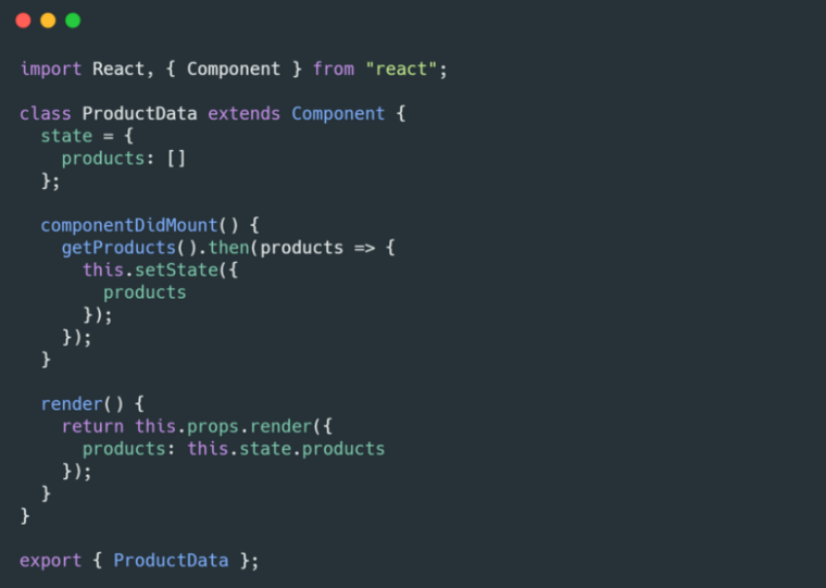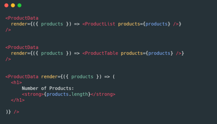 두개의 숫자를 더하는 함수 대신에 상품의 대한 데이터를 가지고 오는 ProductsData component가 있습니다. ProductsData component는 props를 통해 해당 함수를 가지고 옵니다. ProductsData component는 상품의 대한 데이터를 가져오고 데이터를 props로 가져온 함수에게 제공합니다. 그 함수는 상품의 데이터를 가지고 무엇이든 할 수 있게 됩니다. 코드는 아래와 같습니다.