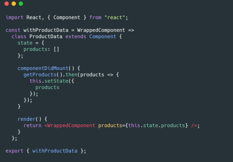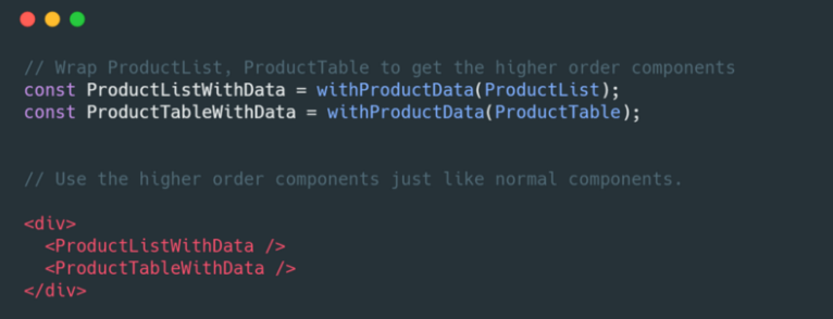 이 패턴에서 우리는 Component를 인자로 취한 함수를 정의하고 동일한 Component이면서 일부 기능이 추가된 Component를 반환합니다.