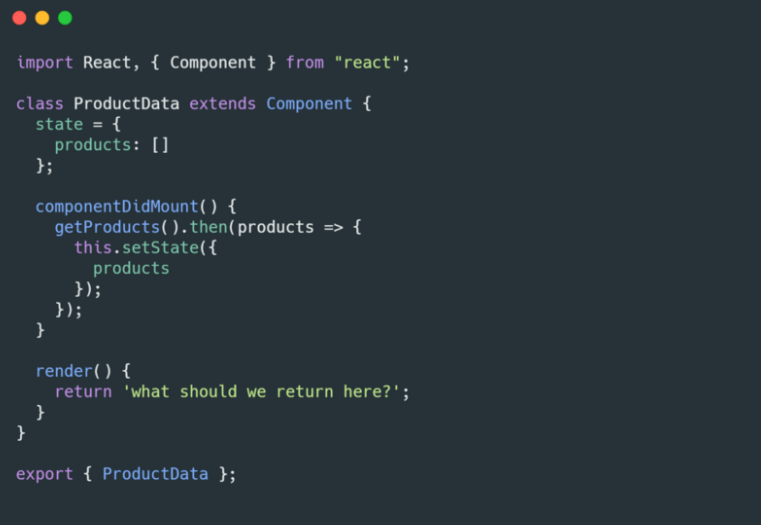 이번에는 ProductsData 이름을 가진 Component를 만들어 보죠. 이는 상품들의 데이터를 API를 통해 가지고 옵니다. 데이터를 가져오고 state를 업데이트하는 것은 원래의 ProductList Component와 동일합니다. 그러면 이 Component의 render 메서드에는 어떤 코드를 써야 할까요?