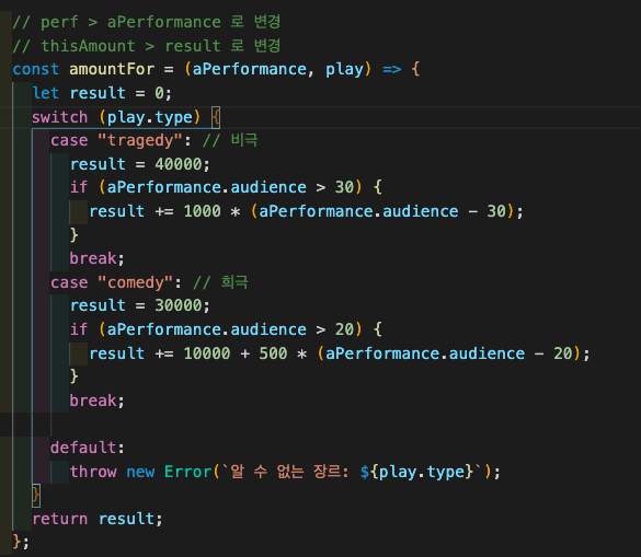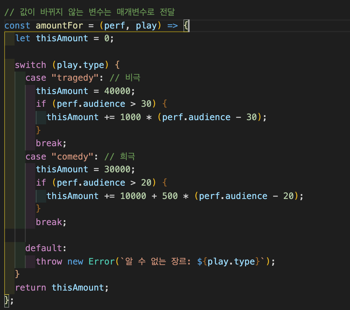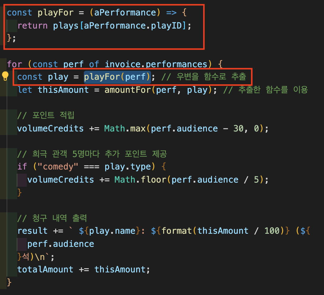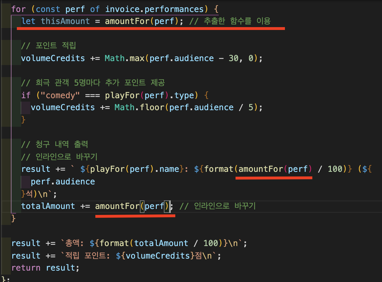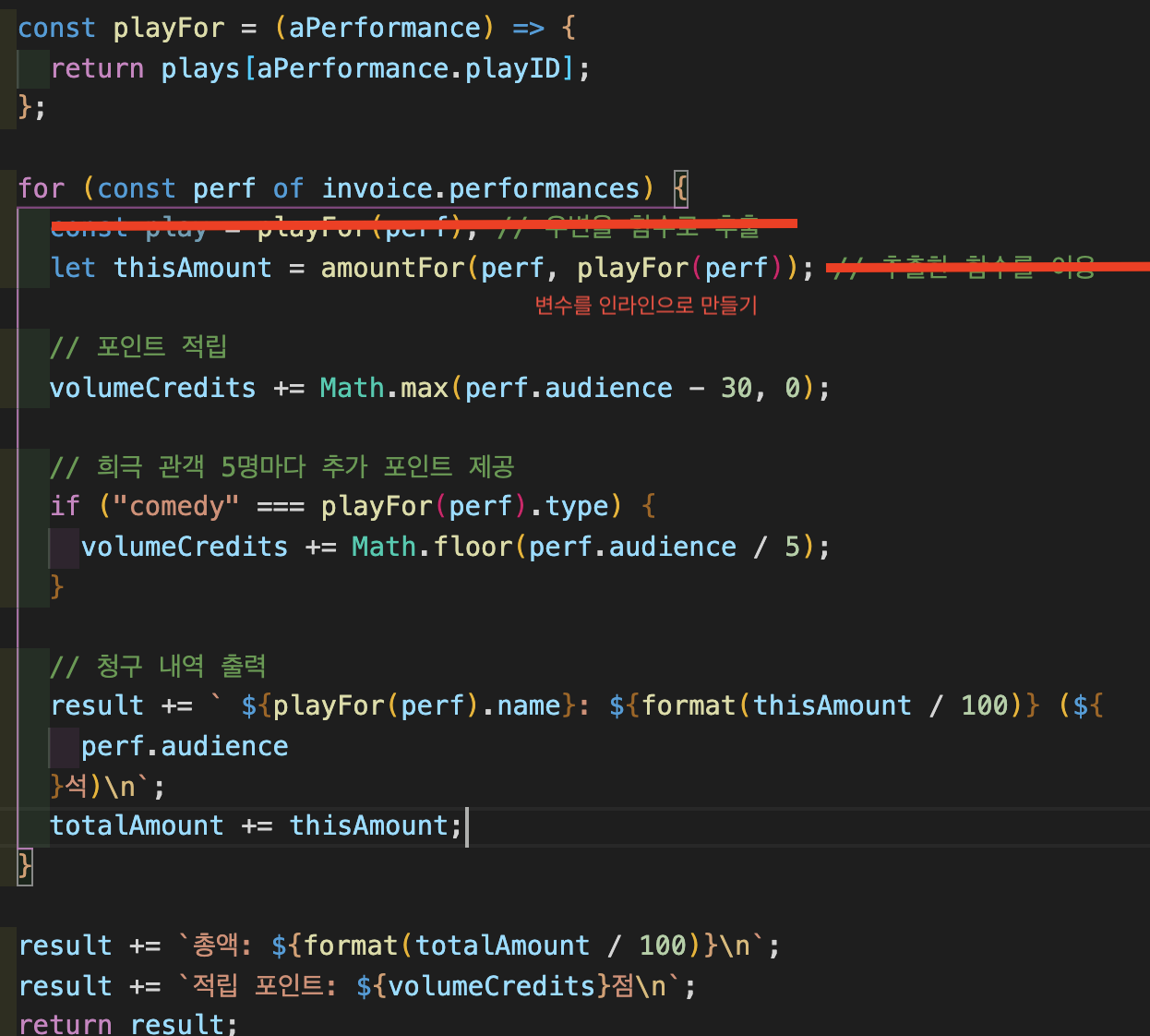 statement() 함수에서는 perf, play, thisAmount가 여기에 속합니다. perf, play는 값이 변경되지 않기 때문에 새로운 함수 매개변수로 전달하면 되지만, thisAmount는 함수 안에서 값이 바뀌므로, 조심해서 변수를 다뤄야 합니다. 새로운 함수에서는 thisAmount 값을 return하도록 작성하였습니다.