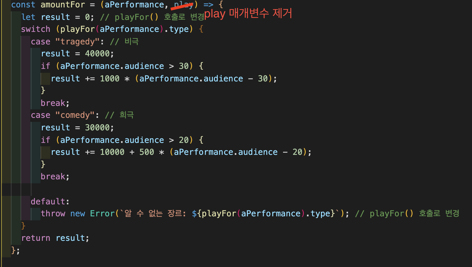 다음은 매개변수 play를 바꿔야 한다. aPerformance는 반복문을 한 번 돌때마다 자연스럽게 값이 변경되지만, play는 aPerformance에서 얻는 값이기 때문에 애초에 매개변수로 전달할 필요가 없습니다. 임시적으로 들어오는 play 와 같은 매개변수는 코드 복잡도를 높이기 때문에 최대한 제거하는게 좋습니다. 이 책에서는 "임시 변수를 질의 함수로 바꾸기"로 통일하여 부릅니다.