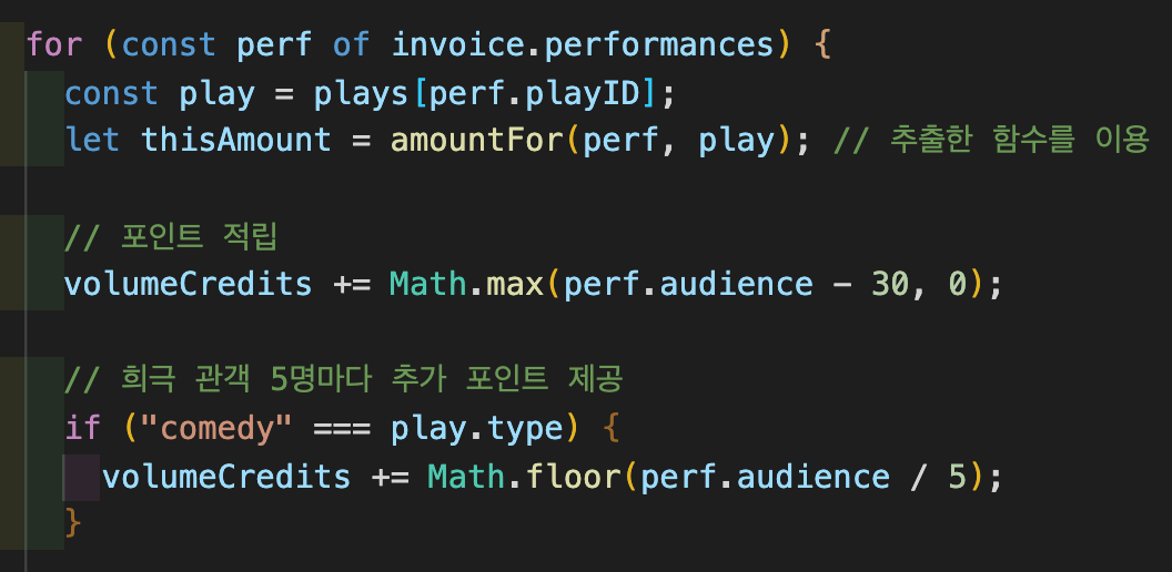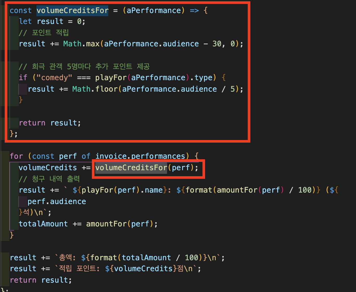 추출한 함수에서는 포인트 적립 변수 volumeCredits 의 값을 초기화한 뒤 계산 결과를 반환하도록 하겠습니다.