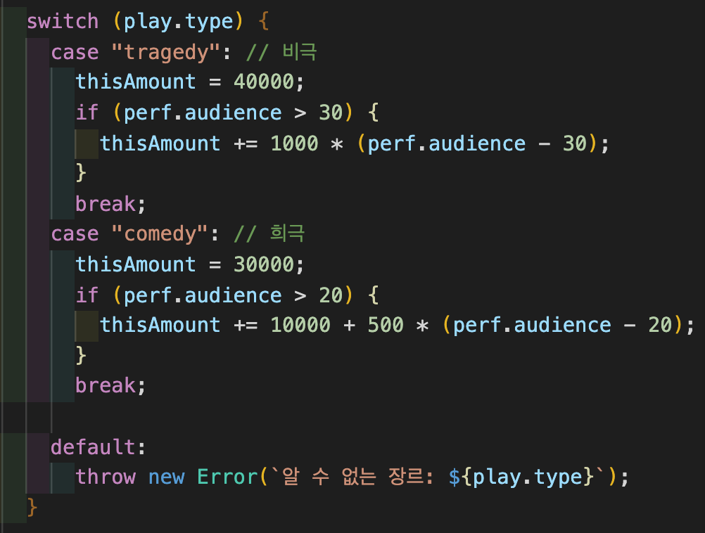 코드 내 switch문의 역할은 한 번의 공연에 대한 요금을 계산합니다. 현재는 비극, 희극 2가지 장르로 구성되어 있지만, 더 다양한 장르가 추가되었을 때 코드가 길어진다는 단점과 그로 인해 생겨날 불편한 사항들을 사전에 차단하기 위해 위에 코드 조각을 별도 함수 amountFor()로 추출하는 작업을 시작합니다. 이러한 행위를 "함수 추출하기"라고 합니다.