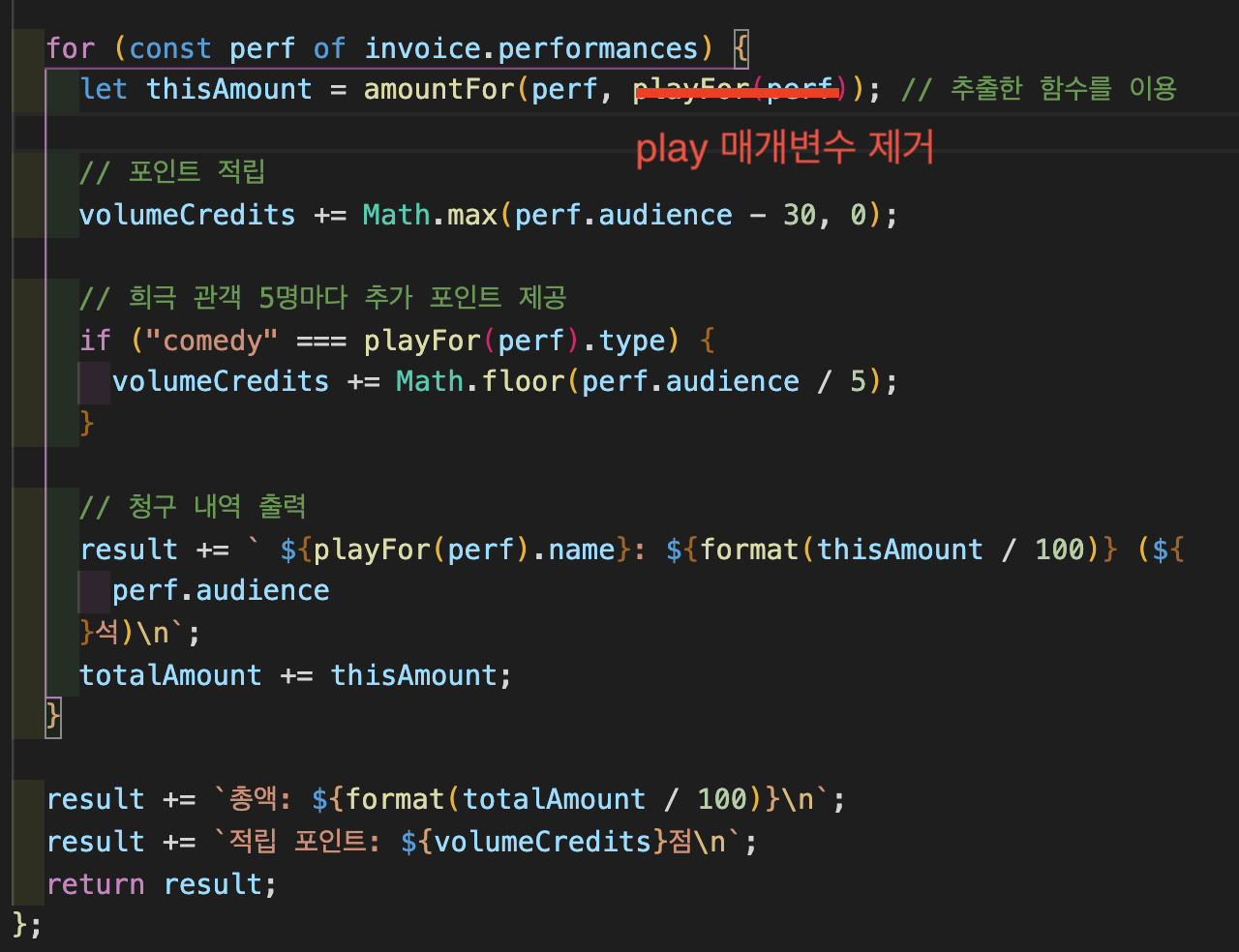 다음은 매개변수 play를 바꿔야 한다. aPerformance는 반복문을 한 번 돌때마다 자연스럽게 값이 변경되지만, play는 aPerformance에서 얻는 값이기 때문에 애초에 매개변수로 전달할 필요가 없습니다. 임시적으로 들어오는 play 와 같은 매개변수는 코드 복잡도를 높이기 때문에 최대한 제거하는게 좋습니다. 이 책에서는 "임시 변수를 질의 함수로 바꾸기"로 통일하여 부릅니다.