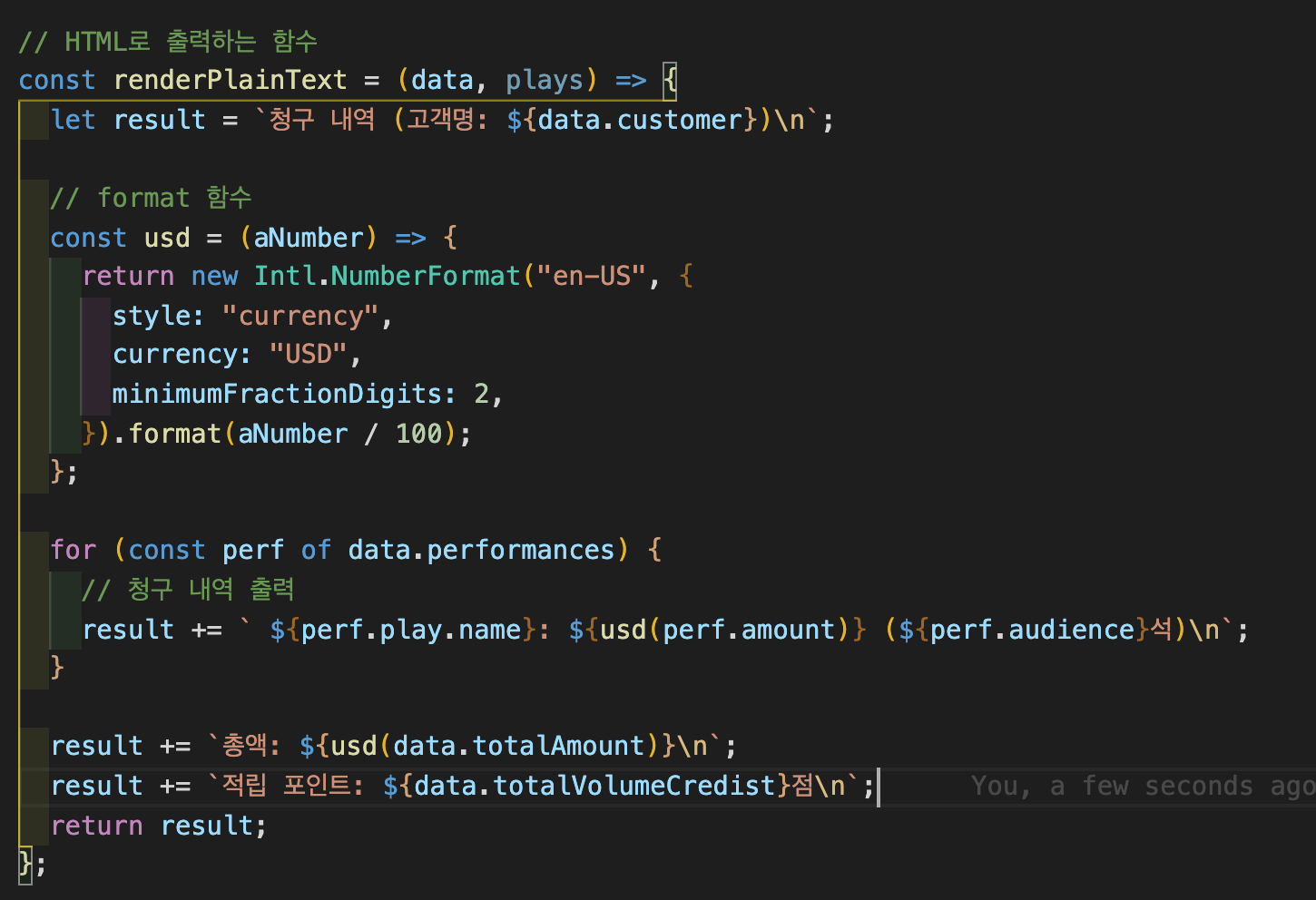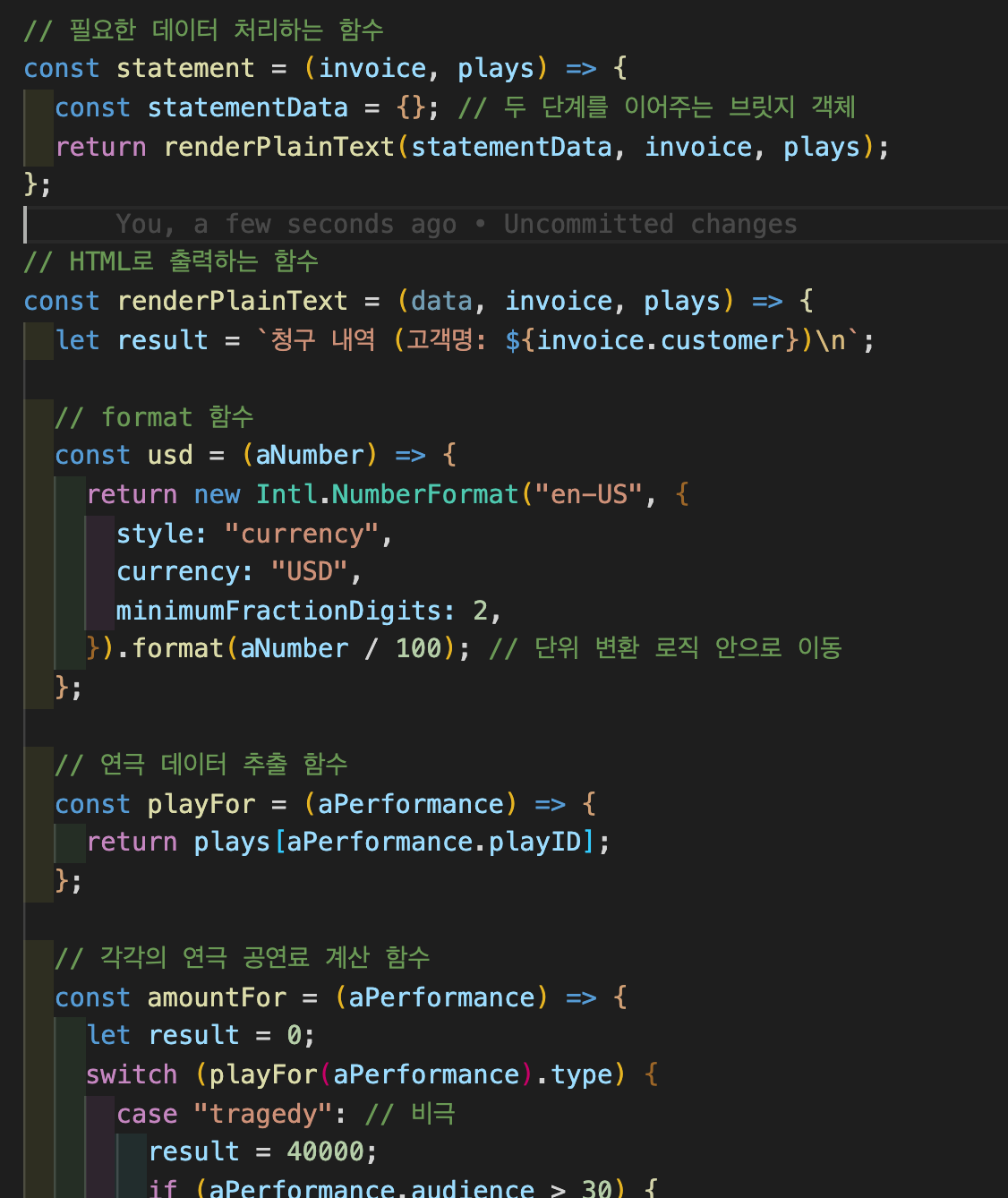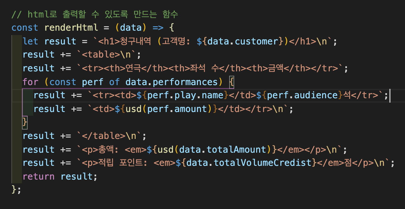 Refactoring(3)에서는 계산 단계와 포맷팅(html로 표현)분리하기 부분을 다루도록 하겠습니다.