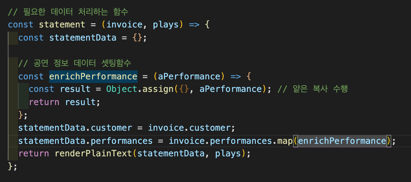 얕은 복사를 수행하여 연극 정보를 담을 객체를 만들었으니, 연극 정보에 대한 데이터를 담아야합니다. 먼저 연극 제목을 담겠습니다. 이를 위해 "함수 옮기기"를 적용하여 playFor() 함수를 statement()로 옮깁니다.