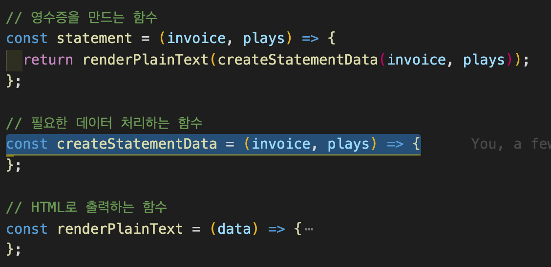 그리고 난 후 statement(), 즉 영수증을 만드는 함수에 필요한 데이터 처리에 대한 코드를 모두 별도 함수로 추출합니다.