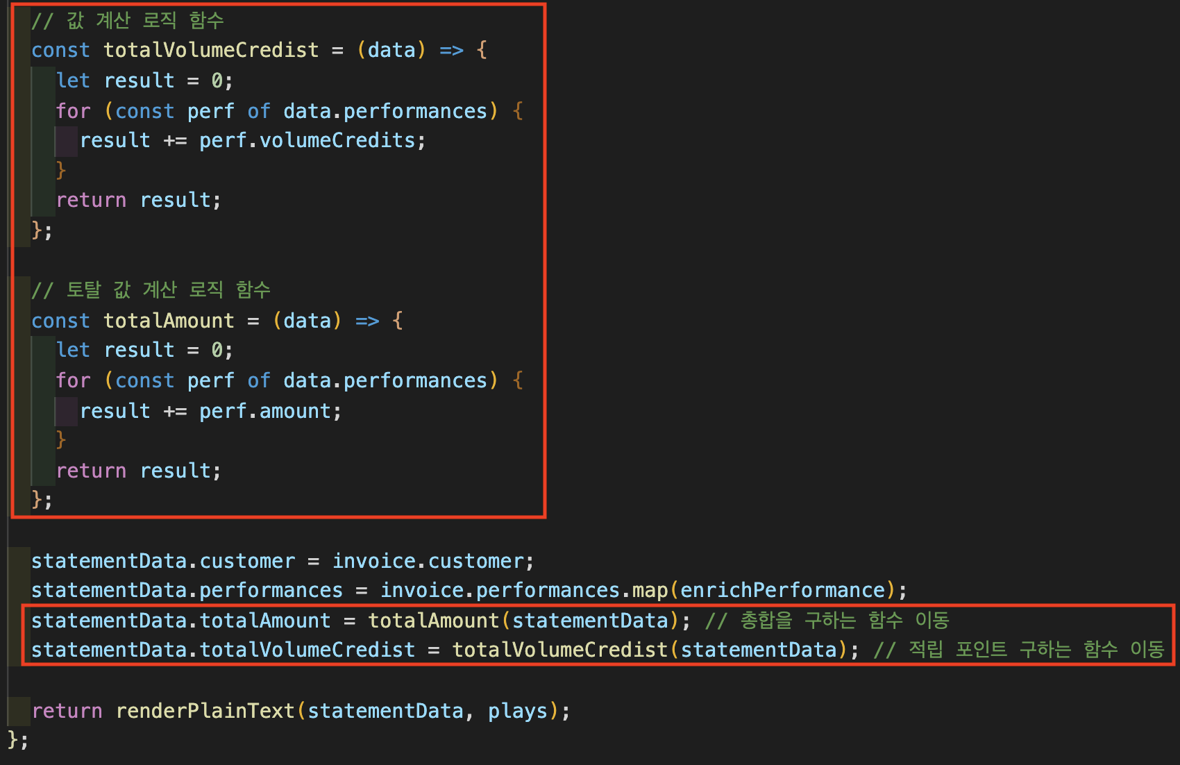 두 단계로 나누었으면 renderPlainText() 함수내에 있는 모든 계산 로직 함수를 다시 statement() 함수로 옮기는 작업이 필요합니다.