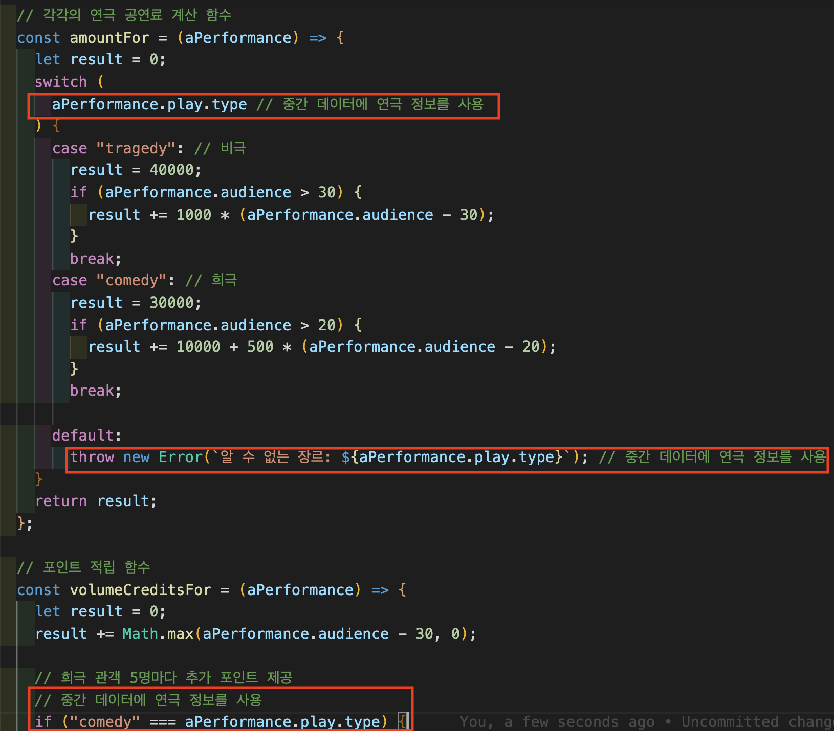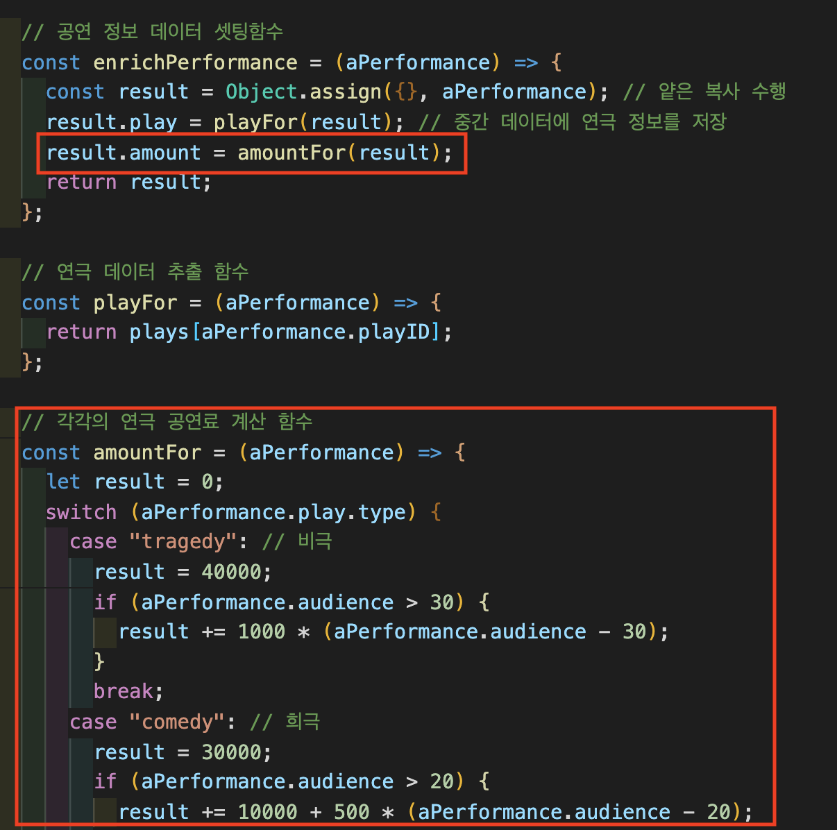 얕은 복사를 수행하여 연극 정보를 담을 객체를 만들었으니, 연극 정보에 대한 데이터를 담아야합니다. 먼저 연극 제목을 담겠습니다. 이를 위해 "함수 옮기기"를 적용하여 playFor() 함수를 statement()로 옮깁니다.