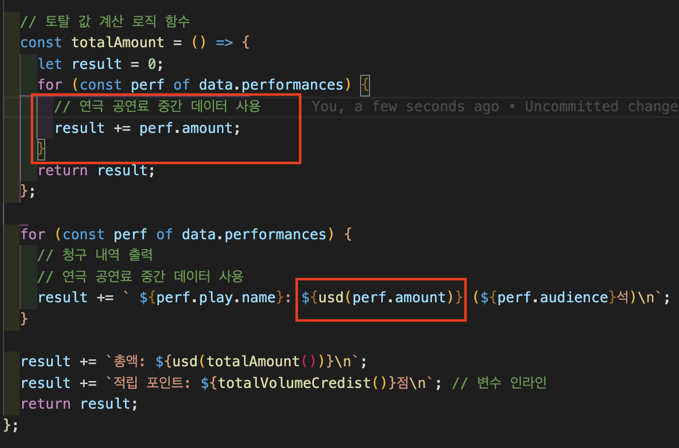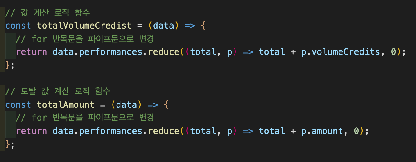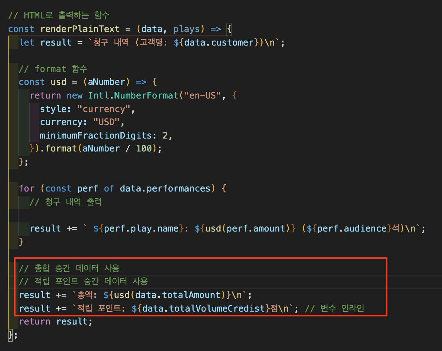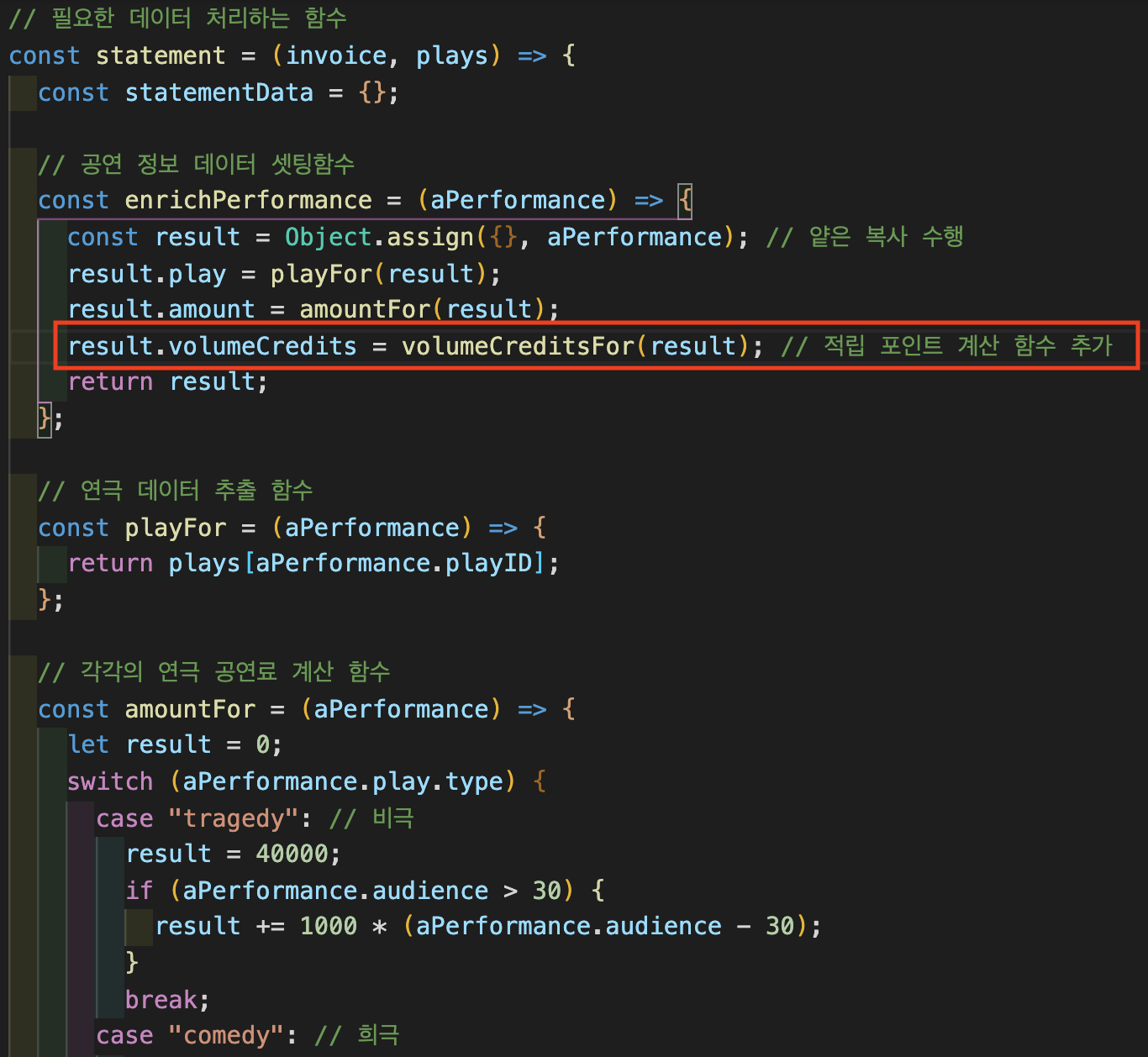 result.volumeCredits = volumeCreditsFor(result); // 적립 포인트 계산 함수 추가