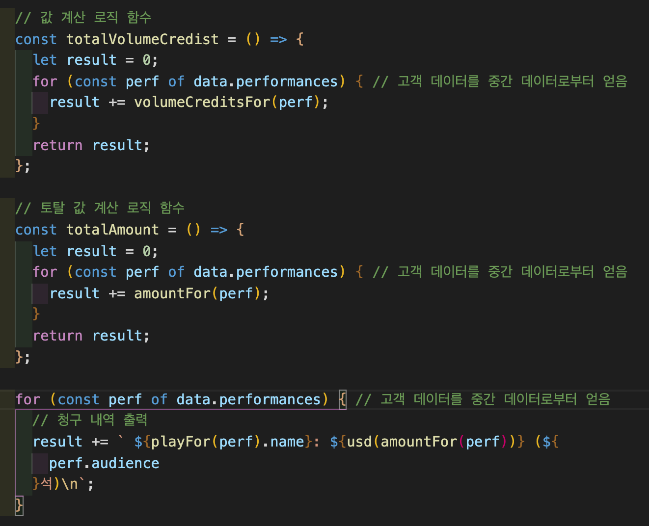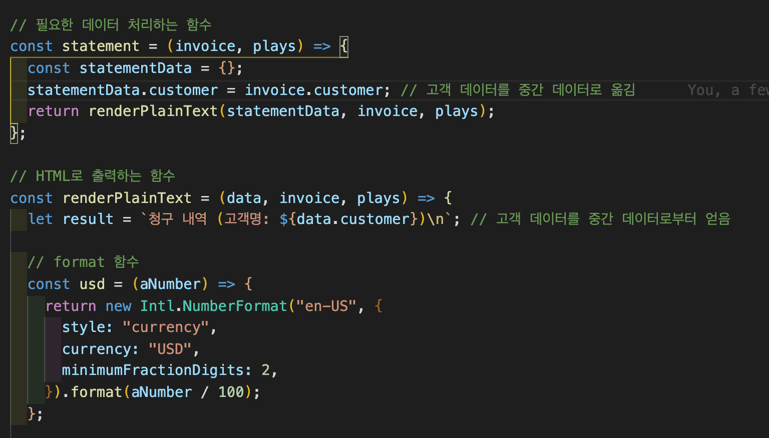 그리고 난 후 statement(), 즉 영수증을 만드는 함수에 필요한 데이터 처리에 대한 코드를 모두 별도 함수로 추출합니다.