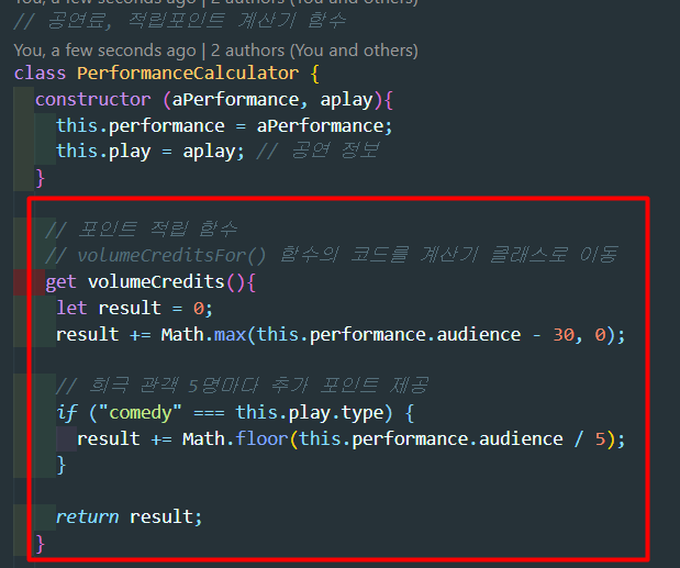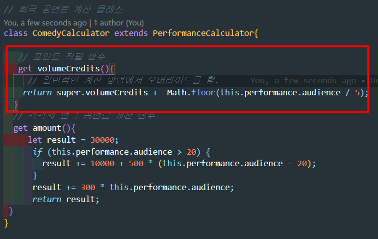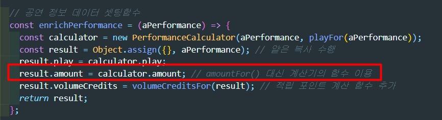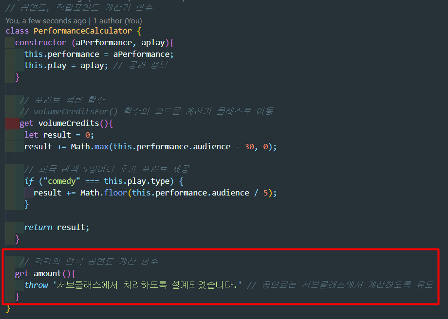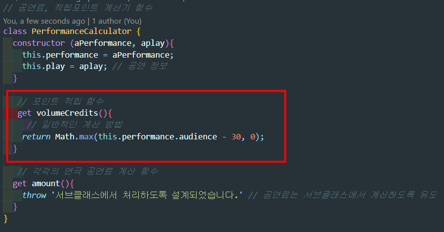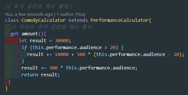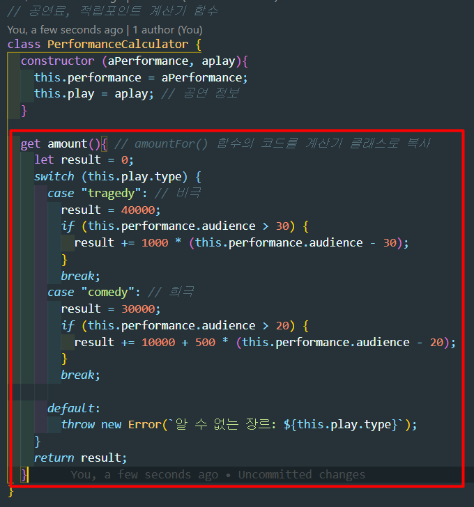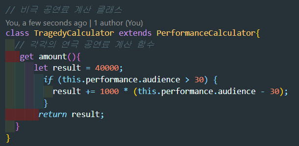공연료 계산 함수 amountFor() 은 Class의 get으로 수정하며 이동합니다.