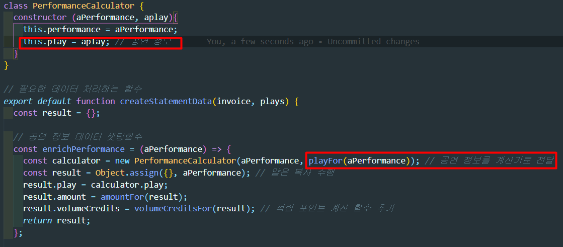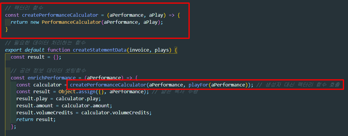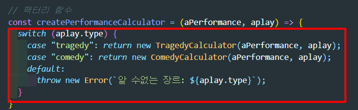 createPerformanceCalculator() 함수의 내부를 Switch 함수를 써서 조건식으로 나누면 됩니다.