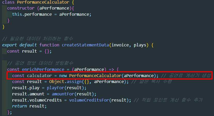 계산 처리를 하는 createStatementData() 함수 내 조건부 로직을 포함한 함수인 amountFor() 과 volumCreditsFor()를 호출하여 공연료와 적립포인트를 계산하는 enrichPerformance() 함수를 주목해야 합니다. amountFor()과 volumCreditsFor() 함수를 공연 관련 데이터를 계산하는 함수들로 구성된 PerformanceCalculator 클래스로 만드는 것부터 시작합니다.
