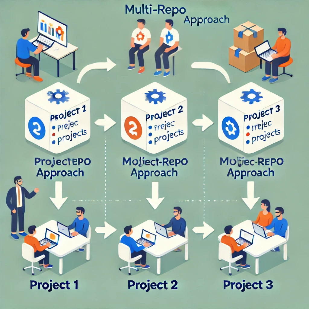 멀티 레포는 소프트웨어 개발 방식으로, 더 큰 애플리케이션의 서로 다른 프로젝트나 구성 요소를 별도의 레포지토리로 저장하고 관리하는 접근 방식을 의미한다. 각 프로젝트나 구성 요소는 자체 버전 관리 레포지토리를 가지며, 이를 통해 팀은 독립적으로 작업할 수 있다.